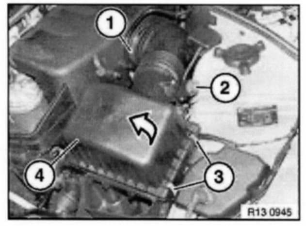Rotate upper section of intake filter housing (4) towards top left. Detach intake hose from intake air manifold.