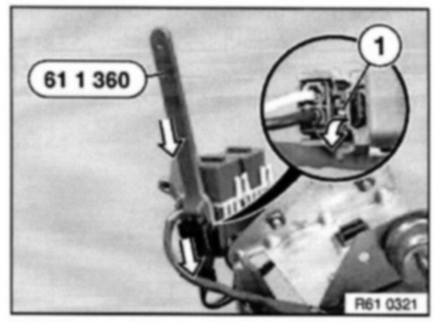 Unlock hook (1) with special tool 61 1 360 and slide plug housing downwards out of base.