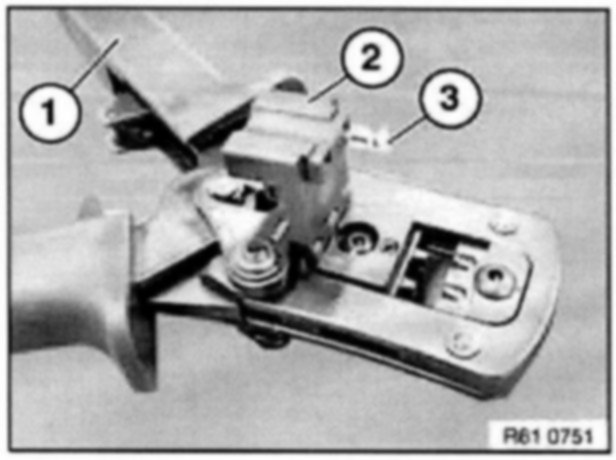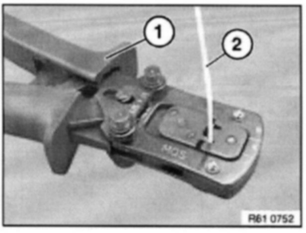 To crimp MQS contacts, use pliers 61 4 321 (1) in conjunction with crimping head 61 4 324 (2) from crimping set 61 4 320