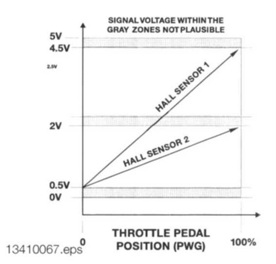 Hall sensor 2 (plausibility) = 0.5 to 2.0 volts