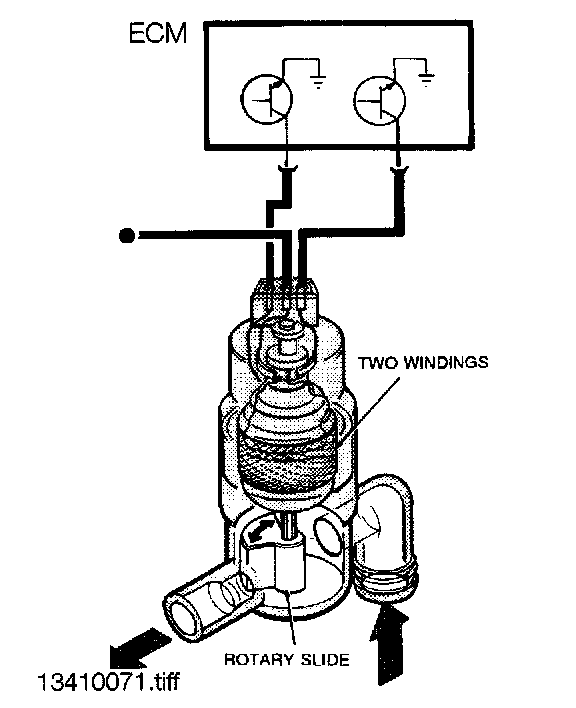 The valve is supplied with operating voltage from the ECM Relay. The ECM is equipped with two final stage transistors which will alternate positioning of the actuator. The final stages are "pulsed" simultaneously by the ECM which provides ground paths for the actuator. The duty cycle of each circuit is varied to achieve the required idle RPM.