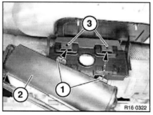 Installation Note: Press rubber-encased lugs (1) on carbon canister (2) into mountings (3).