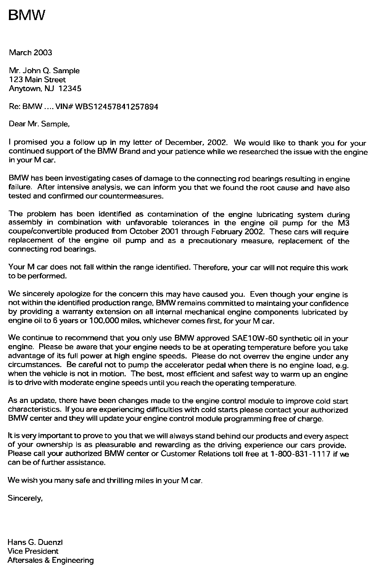 [NEW] Service Action was initiated on those vehicles to replace the engine oil pump, and as a precautionary measure, to replace the connecting rod bearings. Additionally, the engine control module will be programmed with the latest software, which includes improved cold start characteristics. Customers were notified of this Service Action through mailing campaign, initiated at the beginning of April 2003. Service Information B11 02 03 contains a detailed repair instruction as well as all warranty information.