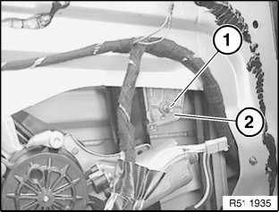 Disconnect plug connection (1) from power window motor (2) (risk of trapping).