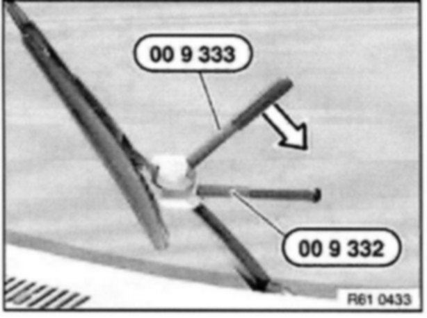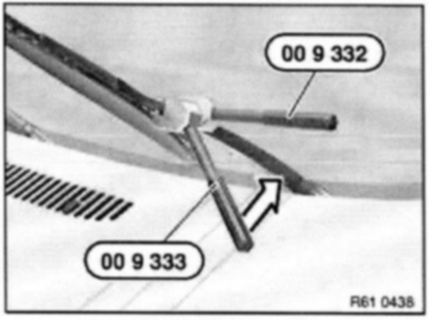 If the approach angle is too small (light gap at bottom between gauge and wiper blade), grip wiper arm special tool 00 9 332 and turn with special tool 00 9 333 in direction of arrow.