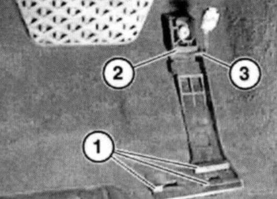 Slide accelerator pedal module first at bottom (1) and then at top (2) into guide rails. Mandrel of adapter plate (3) must penetrate into corresponding opening in accelerator pedal module.
