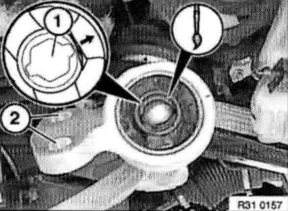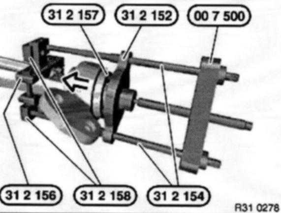 Attach special tool 31 2 153 with extensions (1) from puller set to control arm opening.