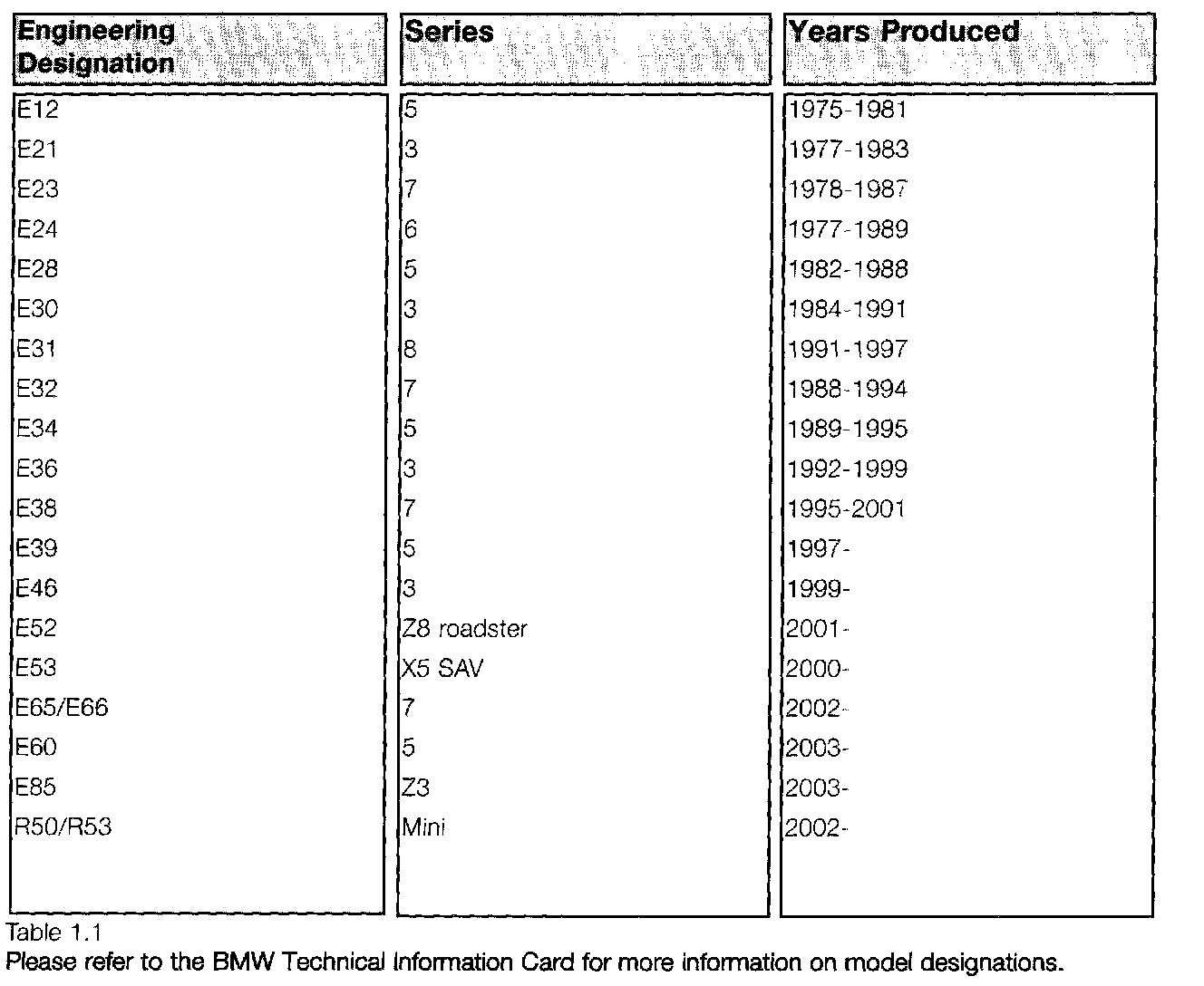 Internal designations are created and used by the Engineering and Technical Development departments to identify a new model during the design of the car. The use of the internal designations carries over to the Technical Support groups after the car is produced. Internal designations refer to the entire vehicle series of a particular body design ( Example: E46 describes all 3 series cars of that design). BMW products start with an "E" and are followed by a two digit number. Not all design concepts make production, so internal designations are usually not sequential. Table 1.1 lists the internal designations, series number and the years produced.