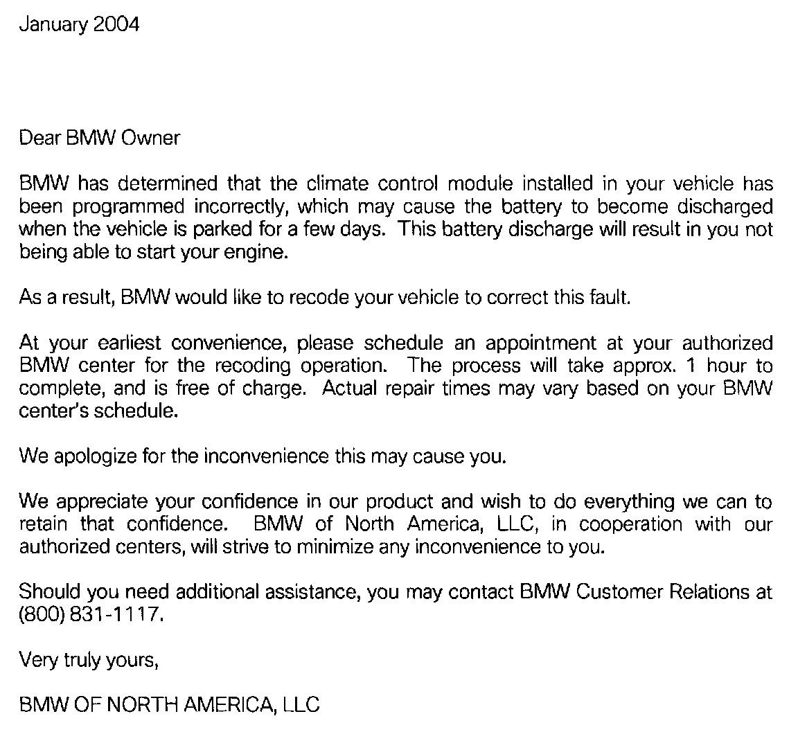 BMW of North America, LLC, will provide reimbursement for vehicle valet services (pick up & delivery) for each vehicle affected by this Service Action. Attach the appropriate receipt to the work order.