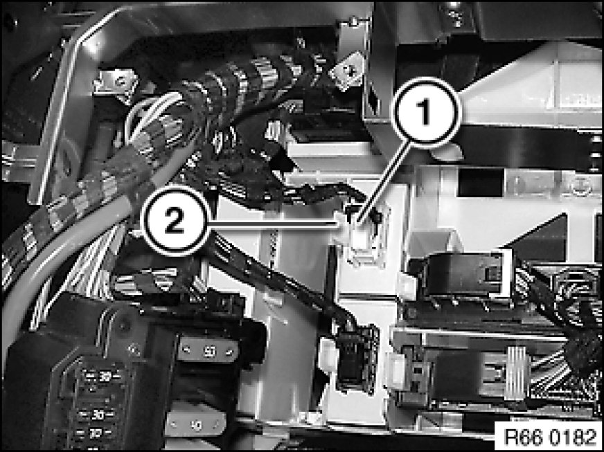 Unlock retaining tab (2) and remove longitudinal dynamics module.