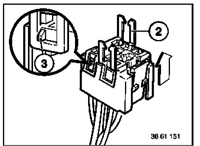 Place special tool 61 1 153 on relay carrier (1) and carefully pull in direction of arrow until retaining lugs (2) on relay carrier are raised.