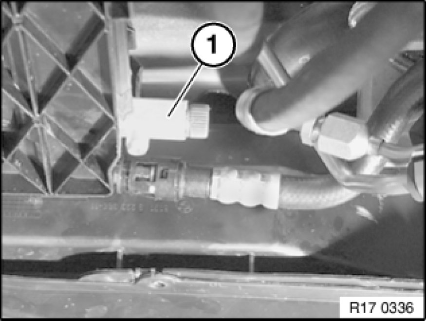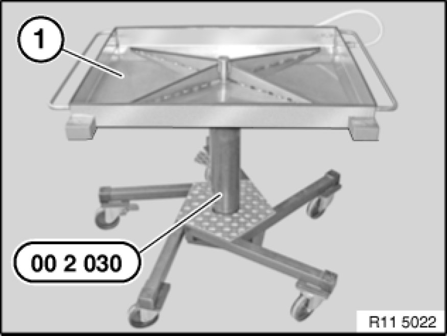 Catch and dispose of drained coolant in drip tray (1) and if necessary special tool 00 2 030 00 2 030 Universal Hydro-Lifter Basic Unit (universal hydraulic lifter).