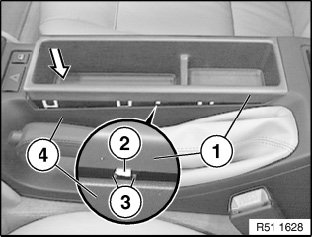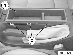 Guide (2) must be positioned between supports (3) of center console (4), insert (1) can now be snapped towards bottom into place.