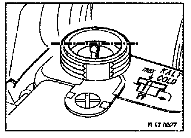 Allow engine to cool down before checking coolant level. Coolant temperature must not exceed 30°C. If ambient temperature exceeds 30°C, allow engine to cool down at least to ambient temperature. Check coolant level; if necessary, top up coolant until liquid level reaches marking on coolant expansion tank.