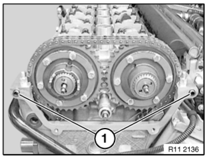 Important! Insert two M6x60 bolts (1) to avoid damaging the VANOS adjustment units.