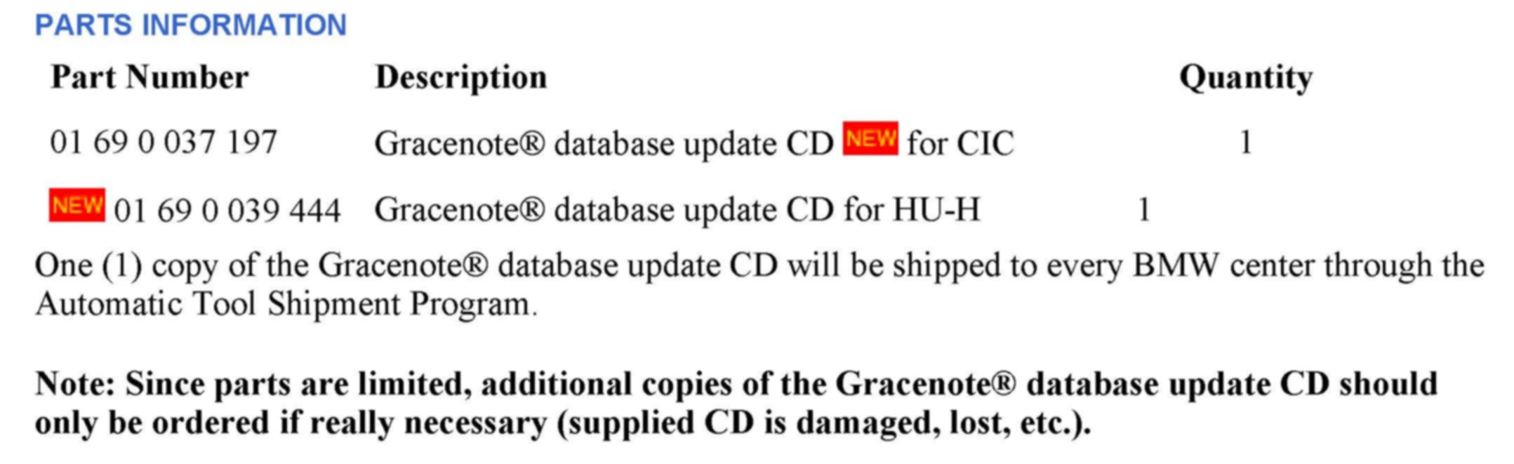 However, BMW is making available updated Gracenote(R) data for those dealers and customers wanting the latest data installed in their vehicles.