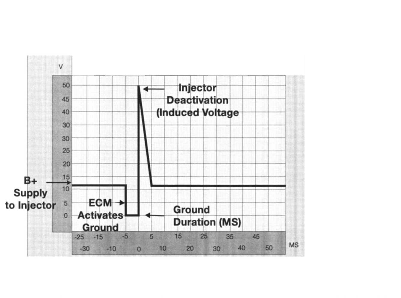 4. ECM Final Stage transistor activation. This test function is found under the Oscilloscope Preset list - "Ti Injection Signal". Install the 88 pin adapter, Diagnostic cable MFK 2 positive lead to the ground activation circuit for the injector. This test is performed with the engine running.