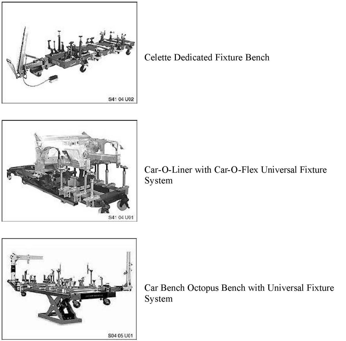 ^ Bench system used with the Car-O-Flex universal fixture system, B66 or B76-B77 side support, in conjunction with the Car-O-Liner electronic measuring system.