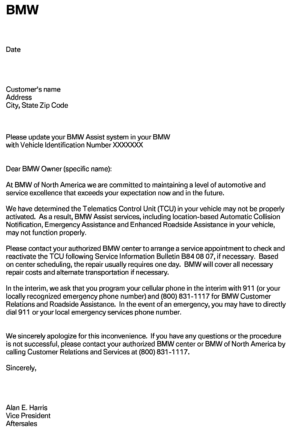 ^ Send via FedEx the TCU, BMW Assist TCU Reactivation Form with the new MIN/MDN numbers and a copy PuMA case to: