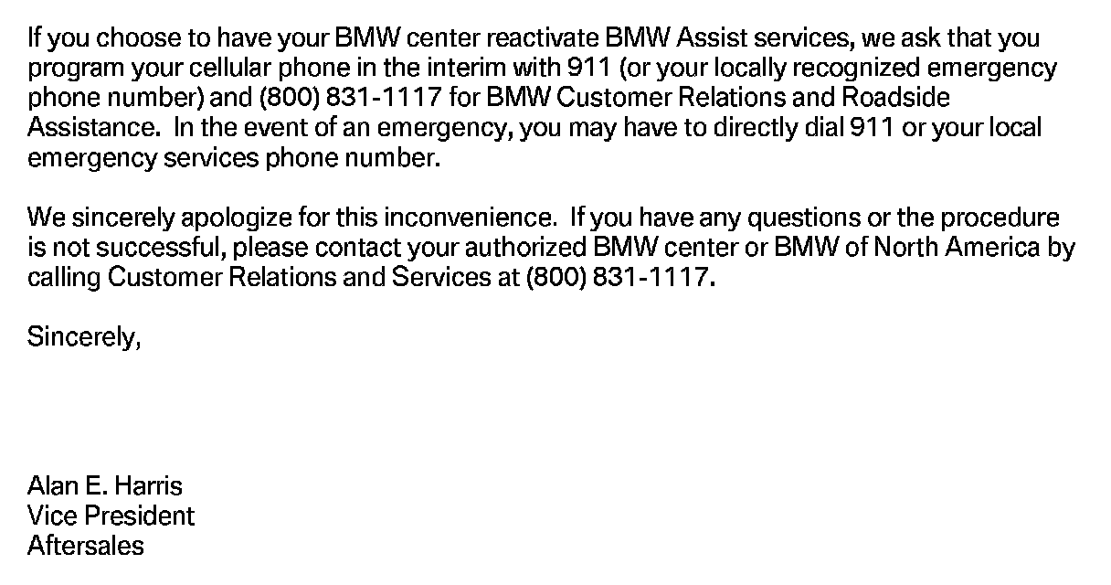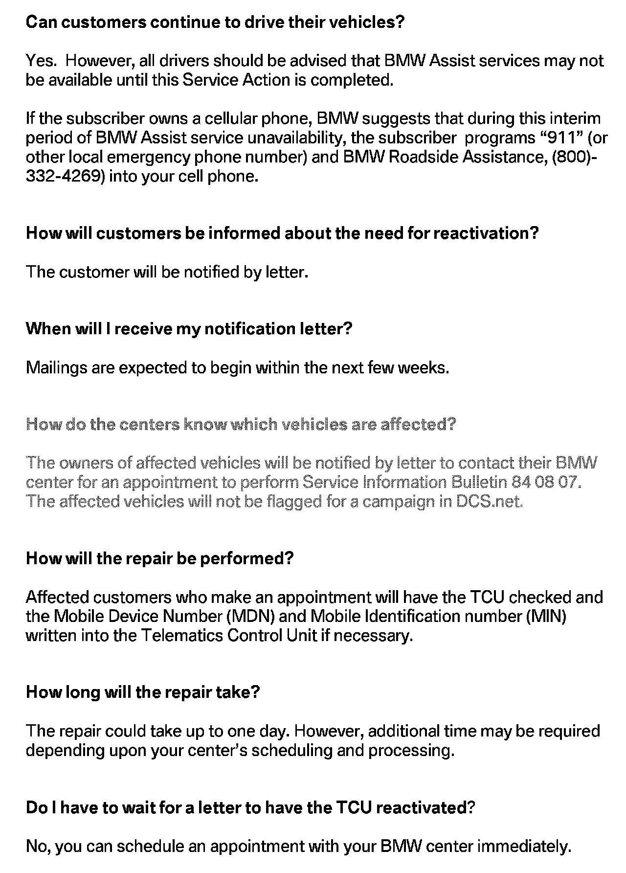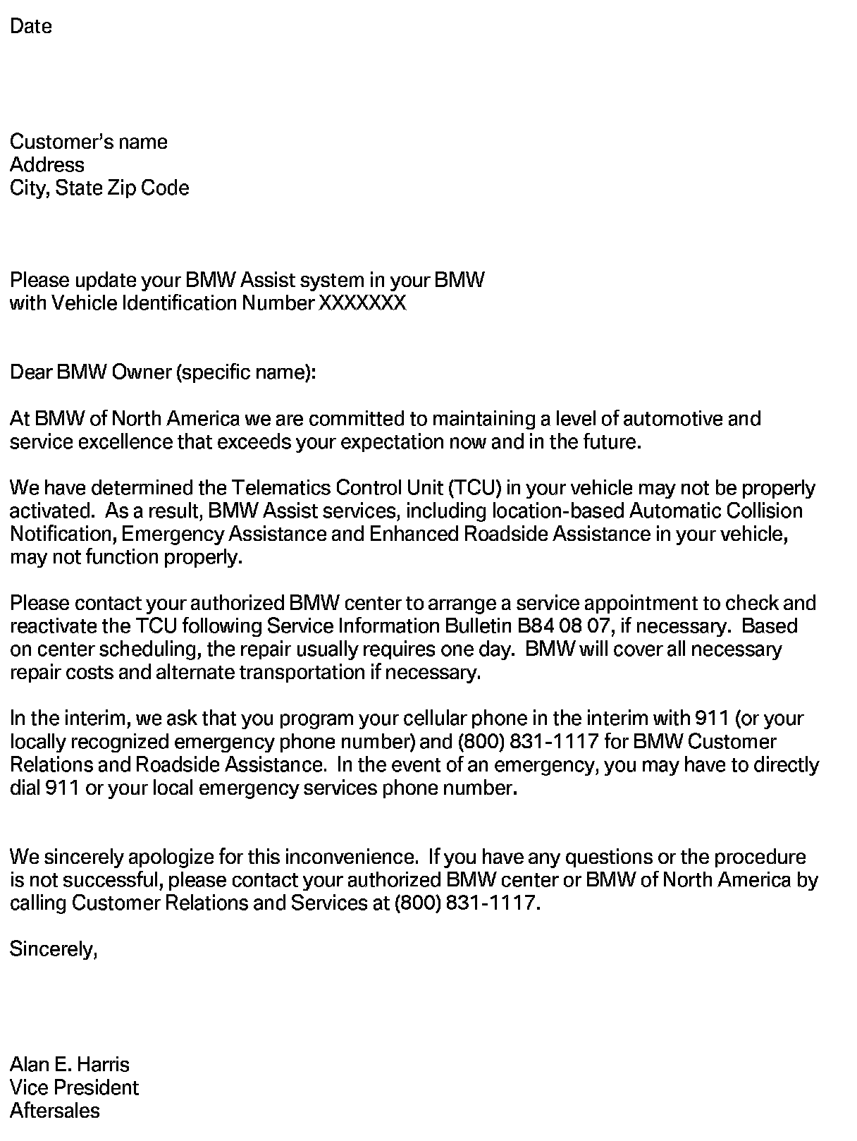 This may cause the manual and automatic emergency call and roadside call (BMW Assisttrade;) not to function. This Service Action reactivates the TCU by assigning a new Mobile Identification Number (MIN) and Mobile Device Number (MDN) to the TCU.