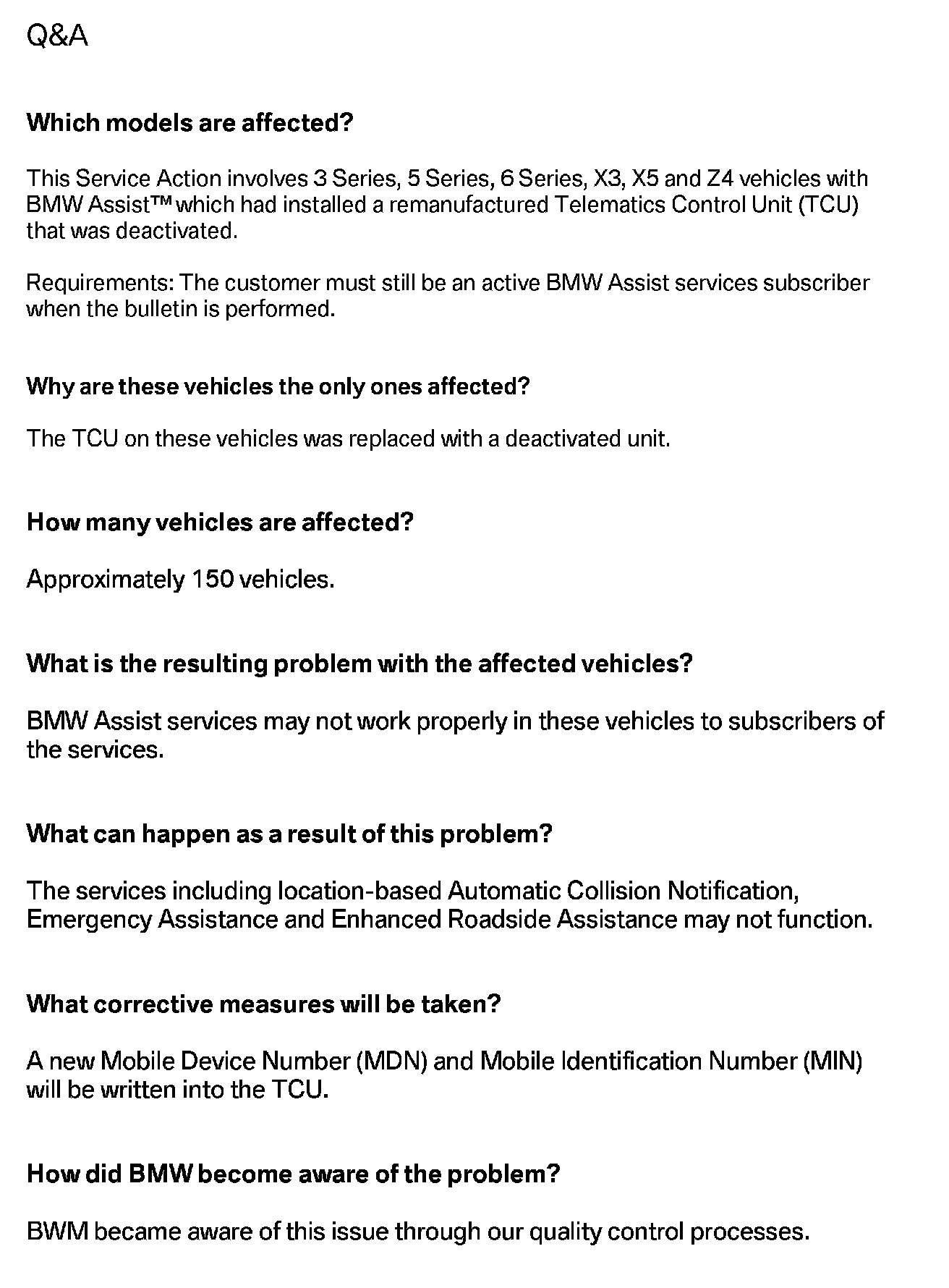 This Service Action involves 3 Series, 5 Series, 6 Series, X3, X5 and Z4 vehicles with BMW Assist which had the TCU replaced between 10/17/2006 and 05/16/2007.