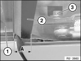 Preset distance (A) under seal (1) at rear to edge of door window (2) at rear.