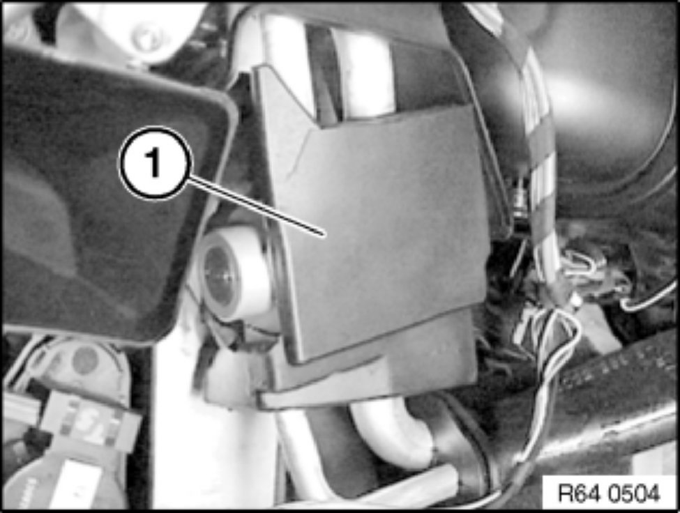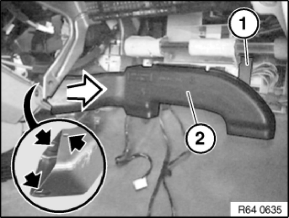 Unclip heating duct for right footwell (2) and remove in direction of arrow.