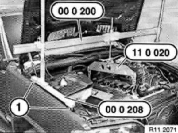 Secure special tool 11 0 020 to front and rear engine suspension eyes.