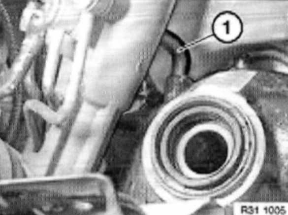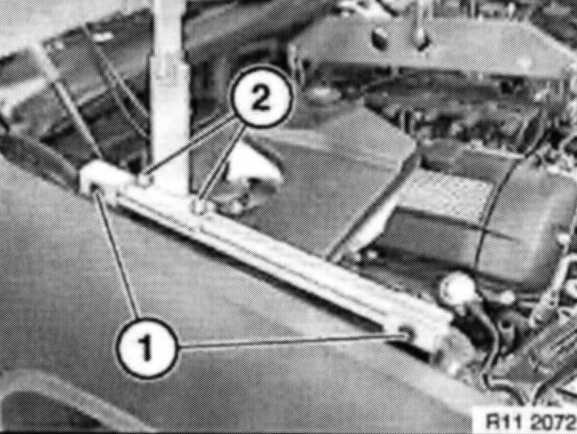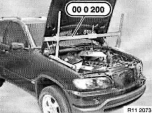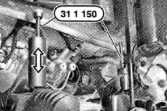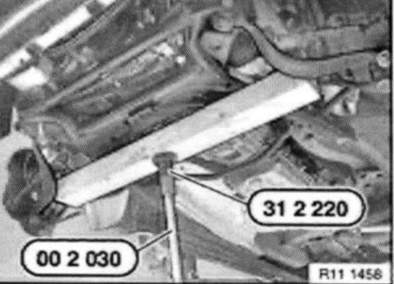 Detach front axle support from engine carrier. Screw in special tool 31 1 150 in place of original screws approx. 20 mm and lower front axle support.
