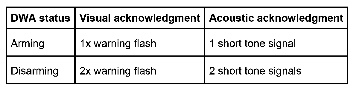 Triggering this "panic" mode triggers an acoustic and visual alarm irrespective of the current DWA state. "Panic" mode is terminated by disarming or arming the antitheft alarm system (DWA) as well as by unlocking the doors with the key.