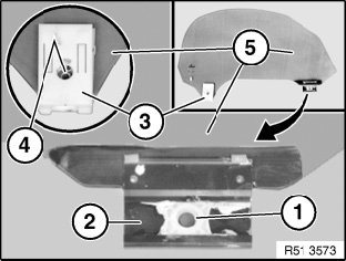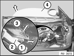 Lever out catch (2) from shim (4) and remove with clamping plate (3) from door window glass (1).