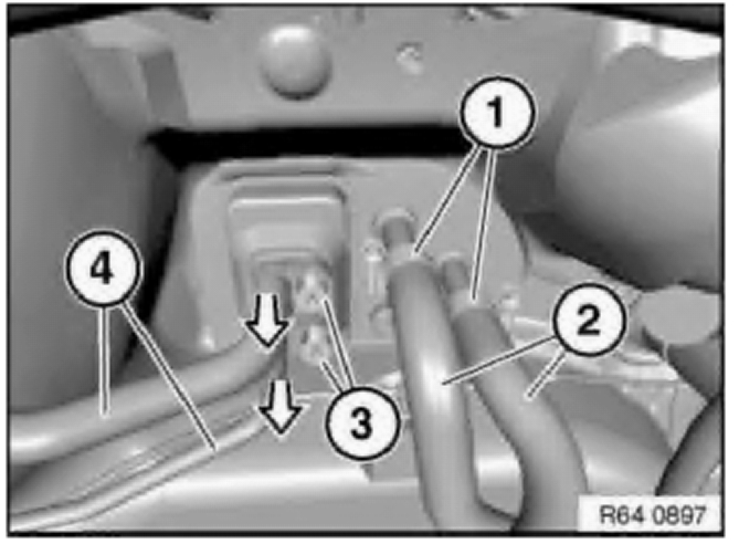 Release screws (3) and detach refrigerant lines (4) in direction of arrow.