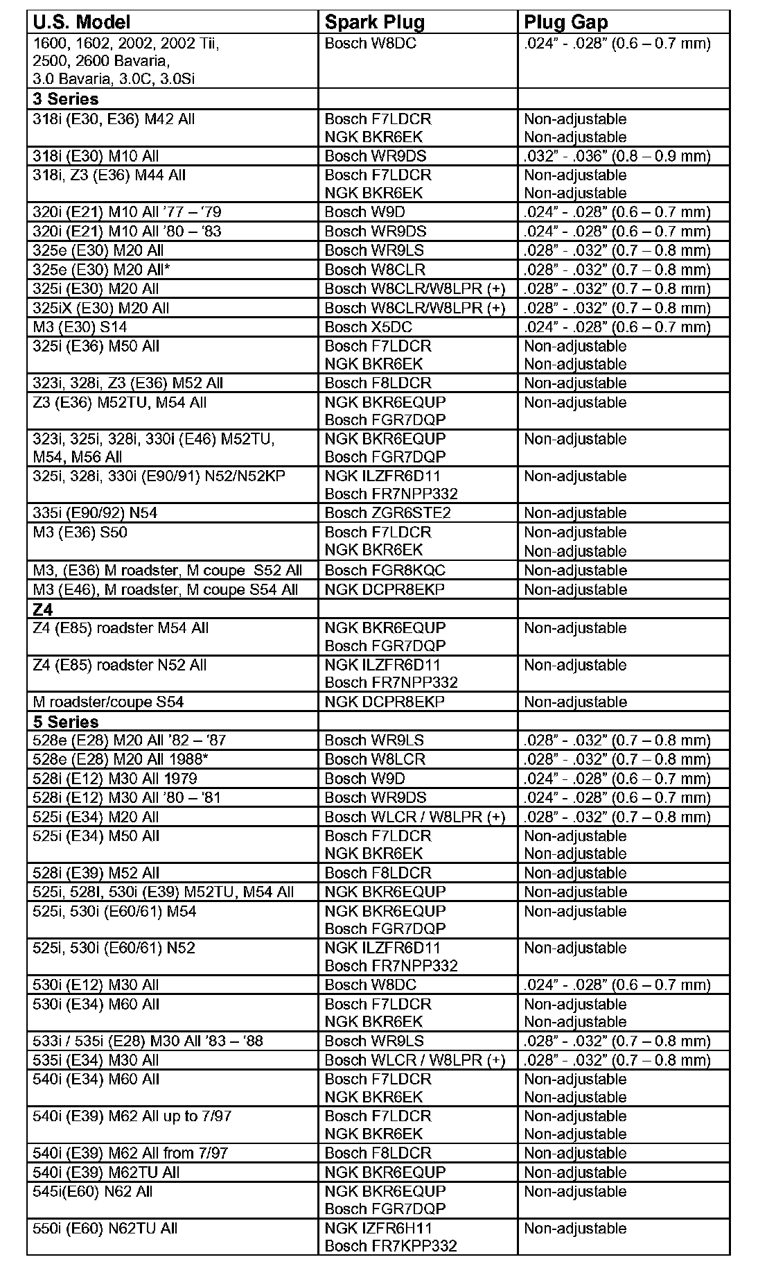 The changes are reflected in the spark plug chart, which now includes updated information on the E90 3 Series, E60 5 Series, E63/64 6 Series, E65/66 7 Series, E85 Z4, E83 X3 and E53/E70 X5.