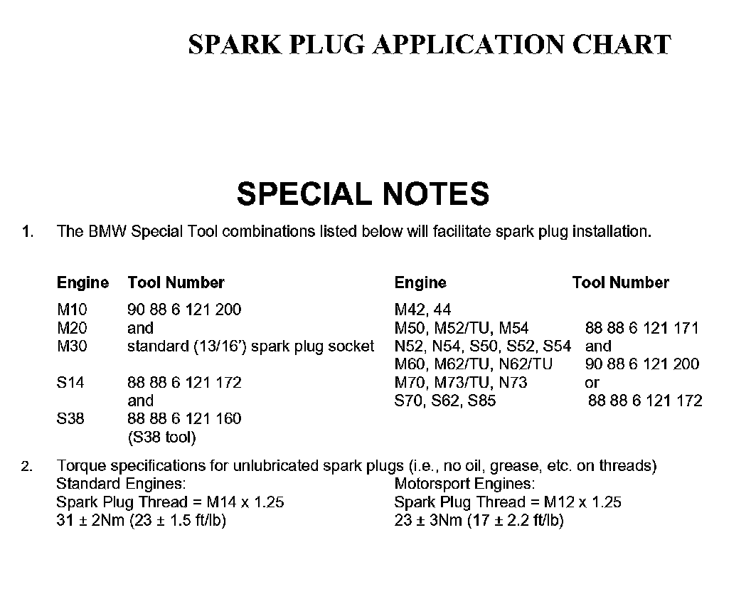 The Spark Plug Application Chart attached includes the spark plug manufacturer, plug designation, tightening torque and special tools to be used when removing and installing spark plugs on all BMW engines.