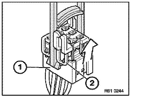 Place special tool 61 1 153 on relay carrier (1) and carefully pull in direction of arrow until retaining lugs (2) on relay carrier are raised.