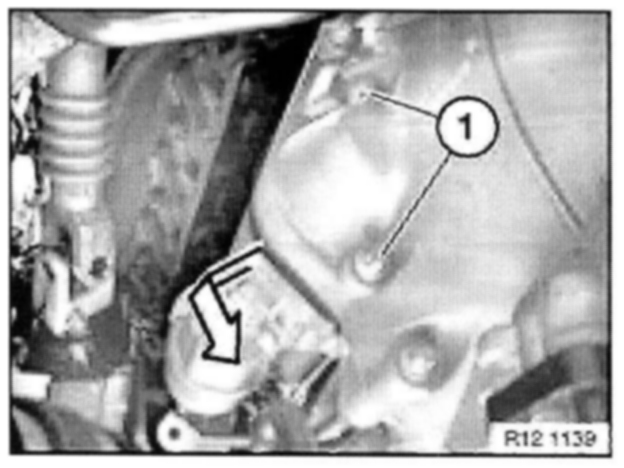 Withdraw starter motor (1) from transmission flange and remove towards bottom.