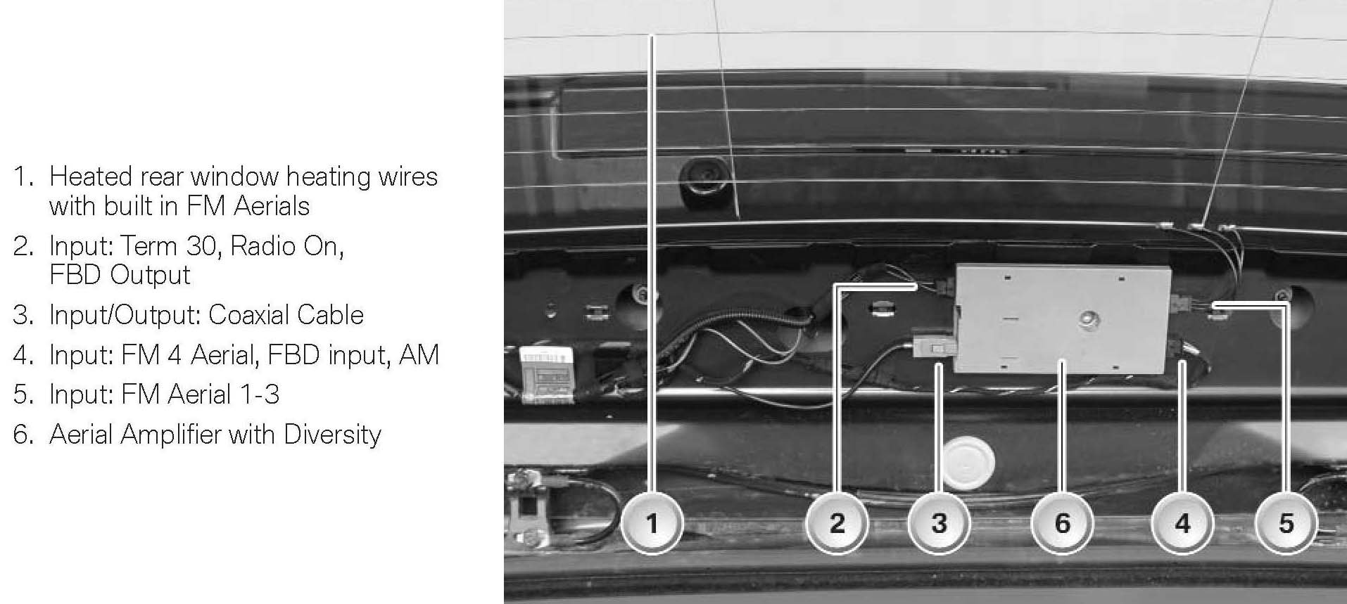 FM Aerial DiversityThe tuner is connected to the aerial diversity module via an aerial connector (Fakra) and a coaxial cable. The antenna diversity switches to the next aerial as soon as the signal quality of the active FM aerial exceeds a defined threshold value. No interruption can be heard when the diversity module switches over. Evaluation of the signal quality and the switch over only occur in the aerial diversity module.