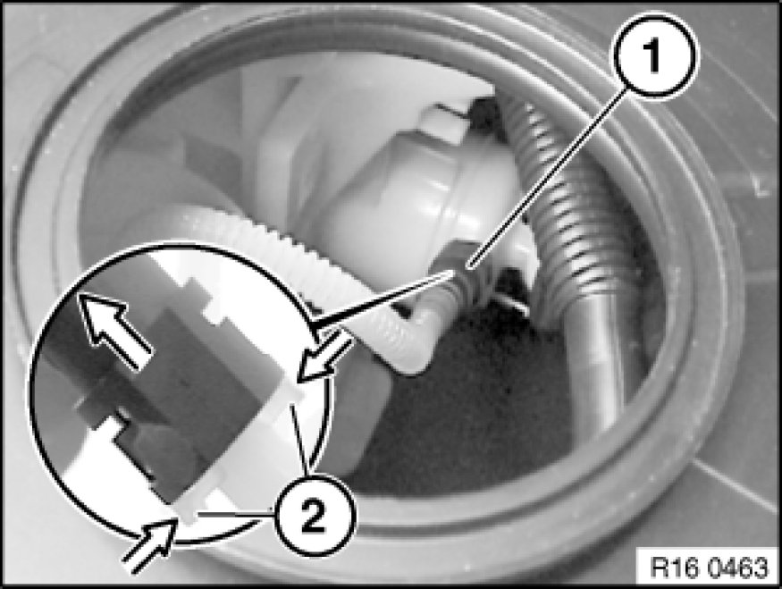Press retaining lugs (2) together simultaneously in direction of arrow and detach fuel line (1) from pressure filter.