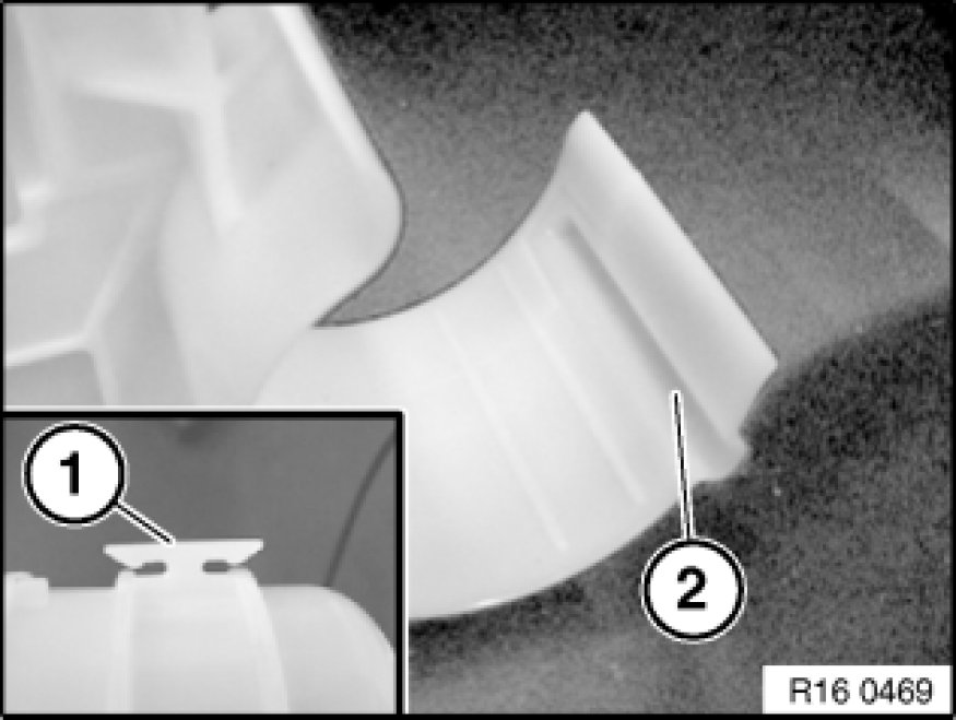 When installing, make sure that turning lock (1) on fuel filter engages opening (2) on fuel filter holder.