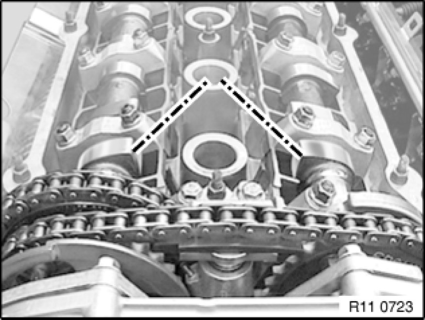 With compressed air supply connected, crank engine twice in direction of rotation until cam tips on inlet and exhaust camshafts on 1st cylinder face each other.