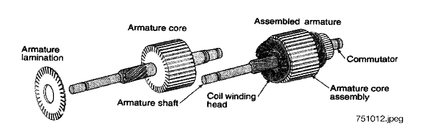 The Armature assembly is comprised of the armature shaft, armature winding, armature stack and commutator. Thin iron stampings are laminated together to form the stack or core. The slots on the outside of the laminations hold the armature windings. The windings loop around the core and are connected to the commutator. Each commutator segment is insulated from the adjacent segments. The commutator may have up to 30 segments. A steel shaft is insert in the center hole of the laminations with the commutator insulated from the shaft.