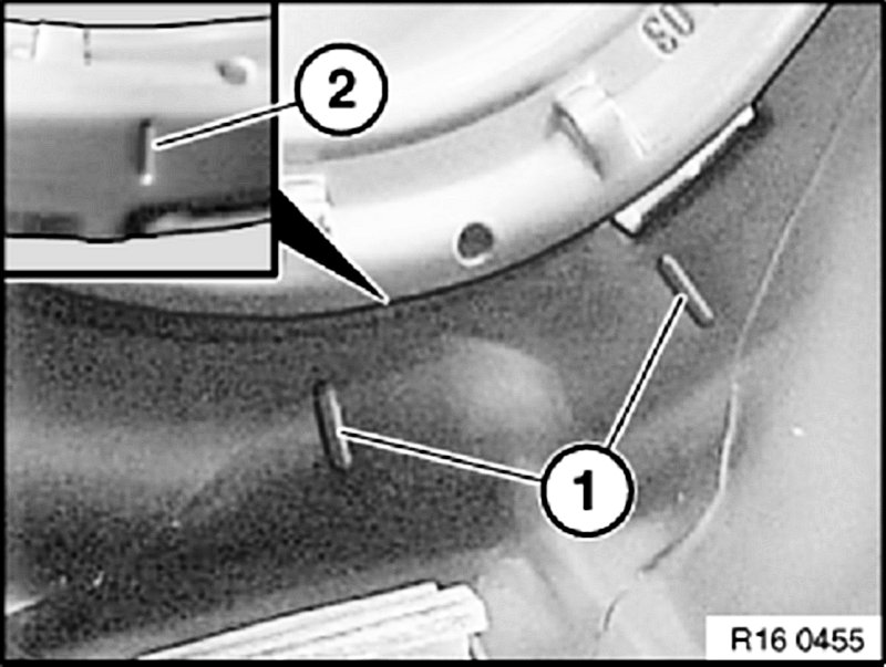 - After tightening to specified torque, make sure the notch (2) on the rotary catch is located between the two markings (1) on the fuel tank.