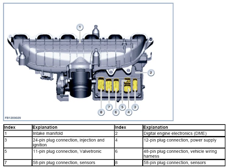 The DME digital engine electronics module is mounted on the intake system in the immediate vicinity of the engine, and is cooled by the flow of induction air. The design of the plug connections between the wiring harness and the DME digital engine electronics module ensures they remain sealed against water when the connectors are plugged in.