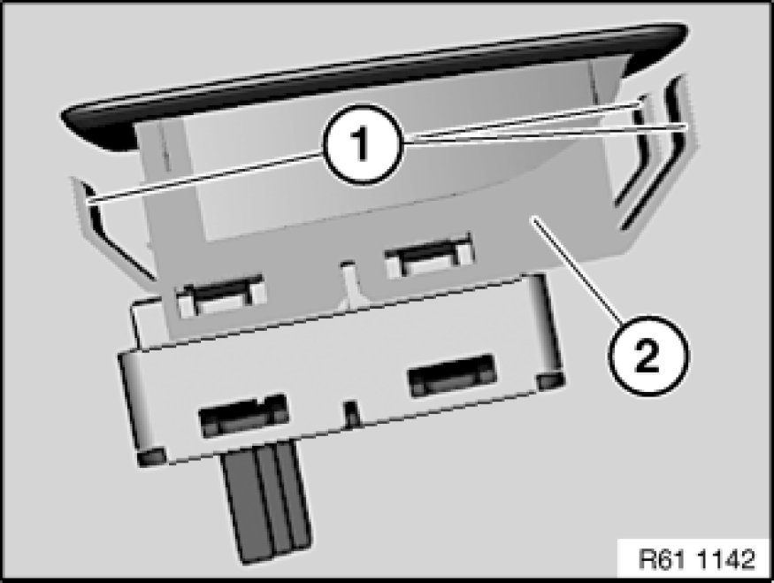 Retaining clips (1) of rocker switch for side window operation (2) must not be damaged or missing.