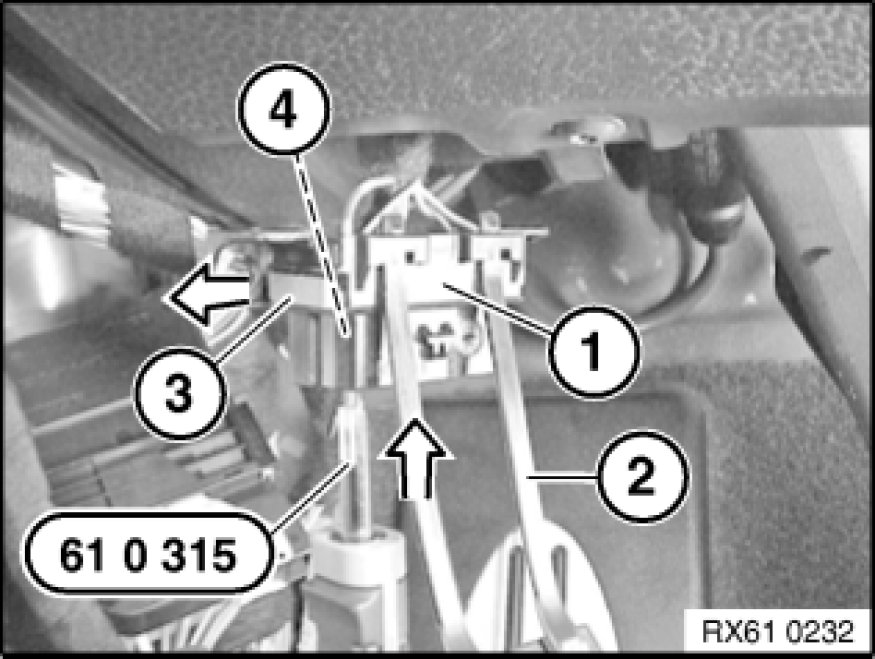 Insert special tool 61 0 315 in OBD-II socket (1) in direction of arrow and press out associated flat spring contact (4). Press remaining flat spring contacts with special tool 61 0 315 out of OBD-II socket (1).