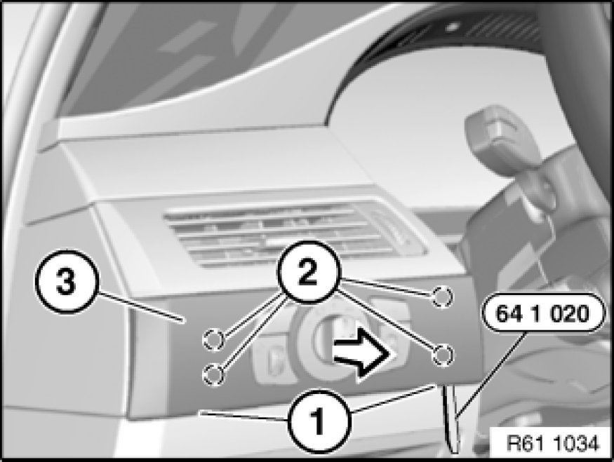 Attach special tool 64 1 020 64 1 020 Release Hook at openings (1) and lever out catches (2).