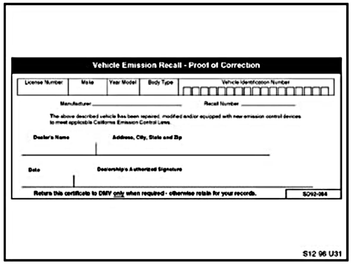 For California centers only: It is required by the California Code of Regulations that an executed orange "Vehicle Emission Recall - Proof of Correction" certificate (SD92-084, see illustration) be provided to each customer (for vehicles registered in the state of California) once the Recall on their vehicle has been completed.