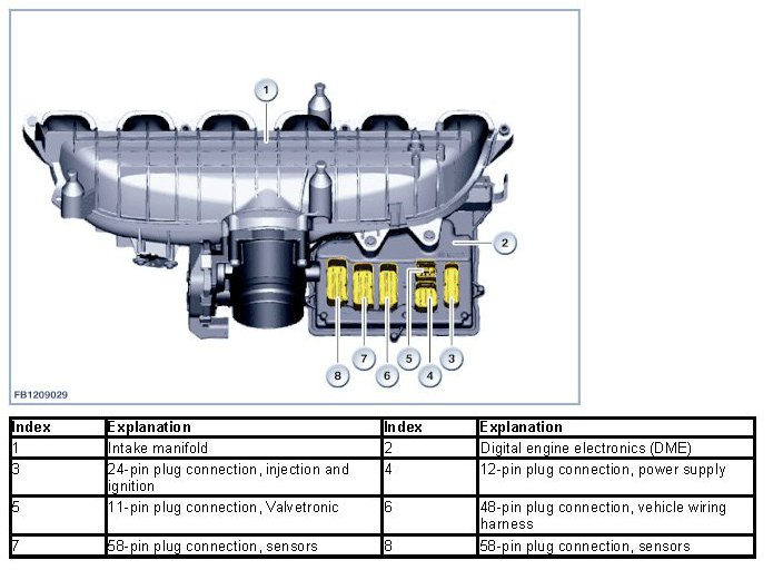 The Digital Engine Electronics (DME) are attached to the intake system close to the engine. This means the Digital Engine Electronics (DME) are cooled by the intake air. The design of the plug connections between the wiring harness and the DME digital engine electronics module ensures they remain sealed against water when the connectors are plugged in.