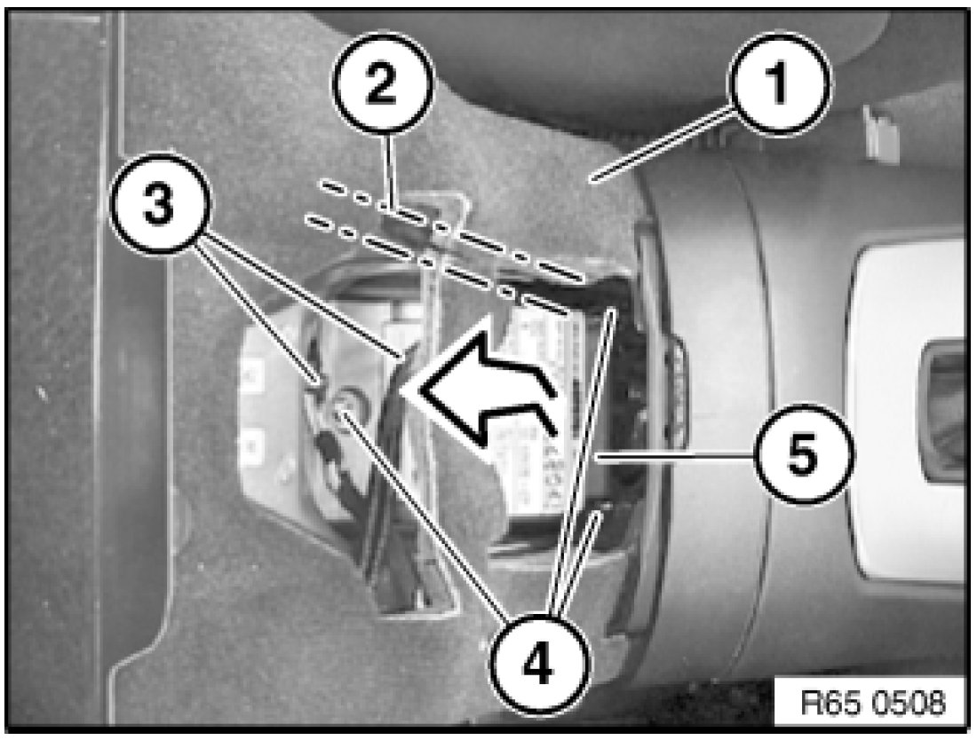 Feed out airbag control unit (5) in direction of arrow and remove.