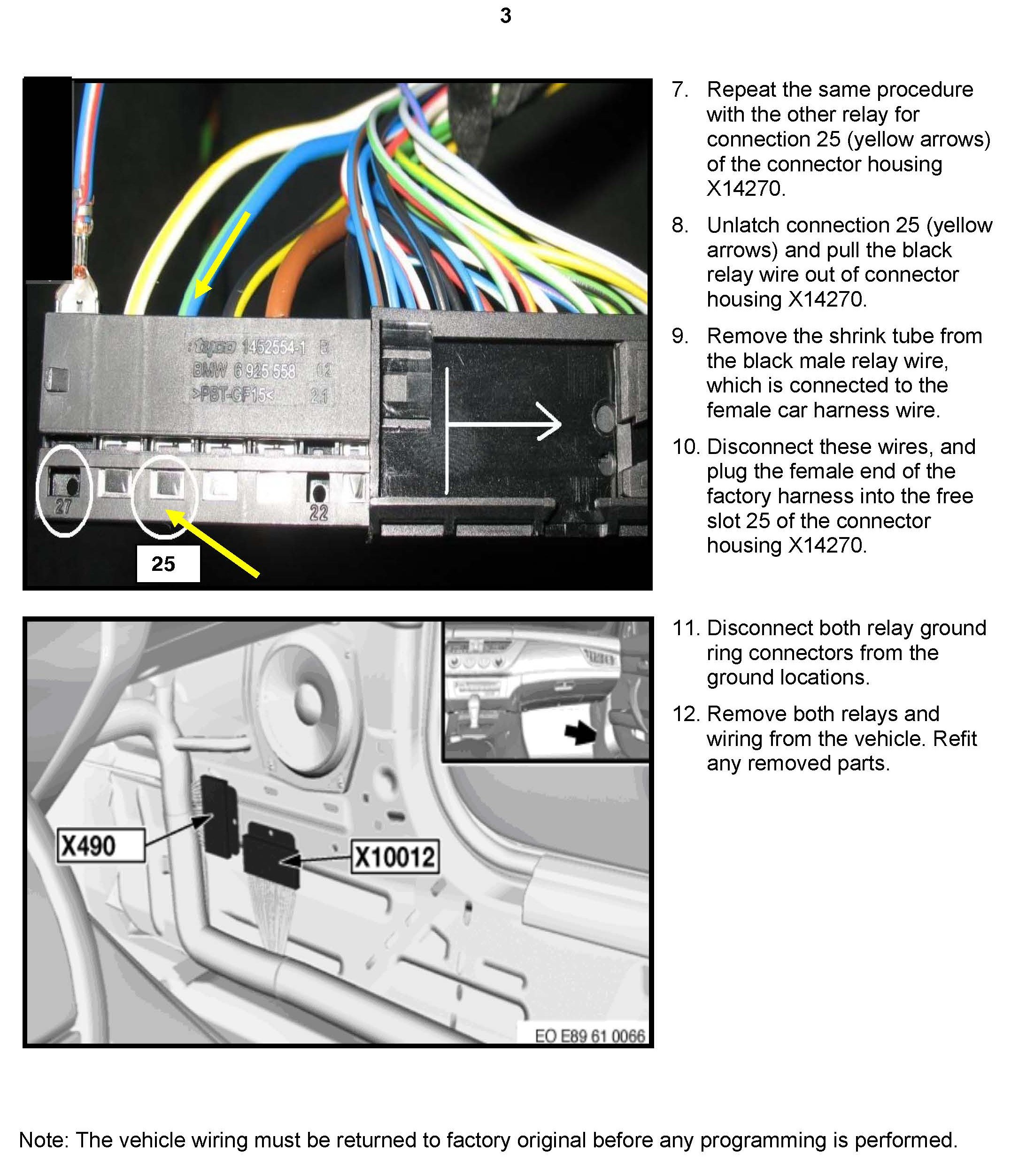 Refer to the attachment, which has been revised to remove the relay kit and wiring. Use this attachment to restore the wiring to its factory-original pin locations.